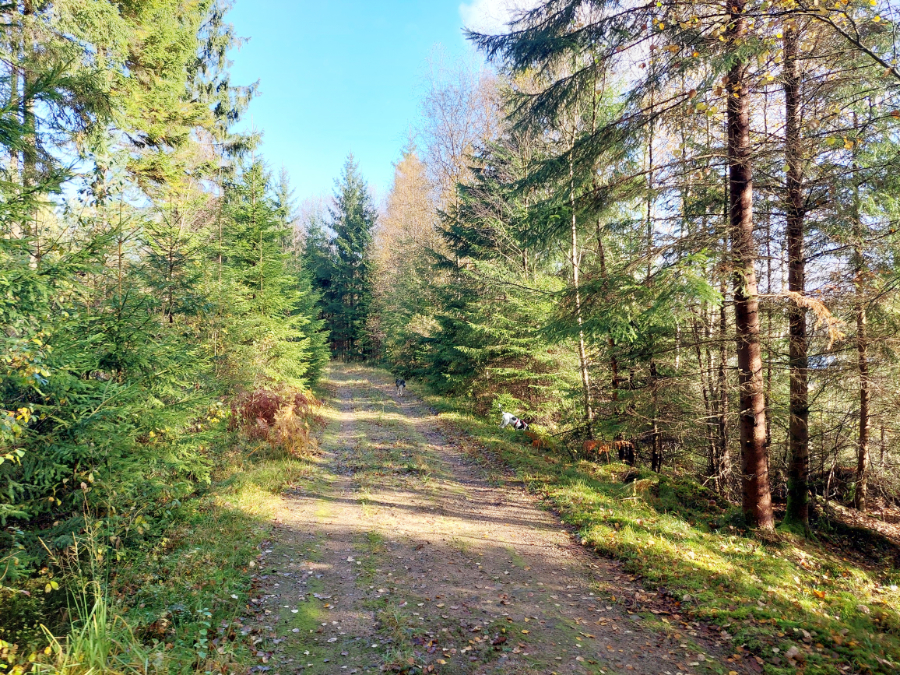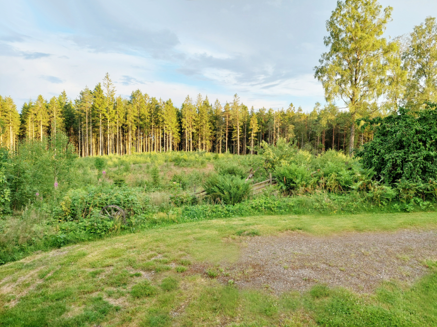 Du siehst auch den Wald, der das ganze Grundstück umgibt. Von hier aus kannst du direkt starten zu Waldspaziergängen.